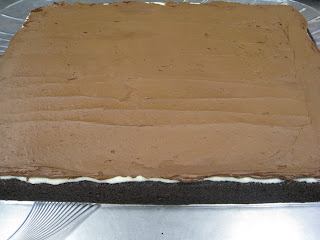 Preheat oven to 350. Prepare your favorite chocolate cake (I used a Devil’s Food boxed mix). Grease and flour a jelly roll pan. Pour batter in the pan and spread around until it’s even. Bake at 350 for 15-20 minutes; this will depend on the cake you bake, but begin to check it after 15 minutes.