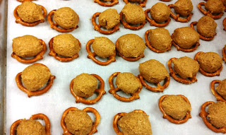 Use a teaspoon measure to scoop the filling. Roll each portion into a small ball, then sandwich them between two whole pretzels.